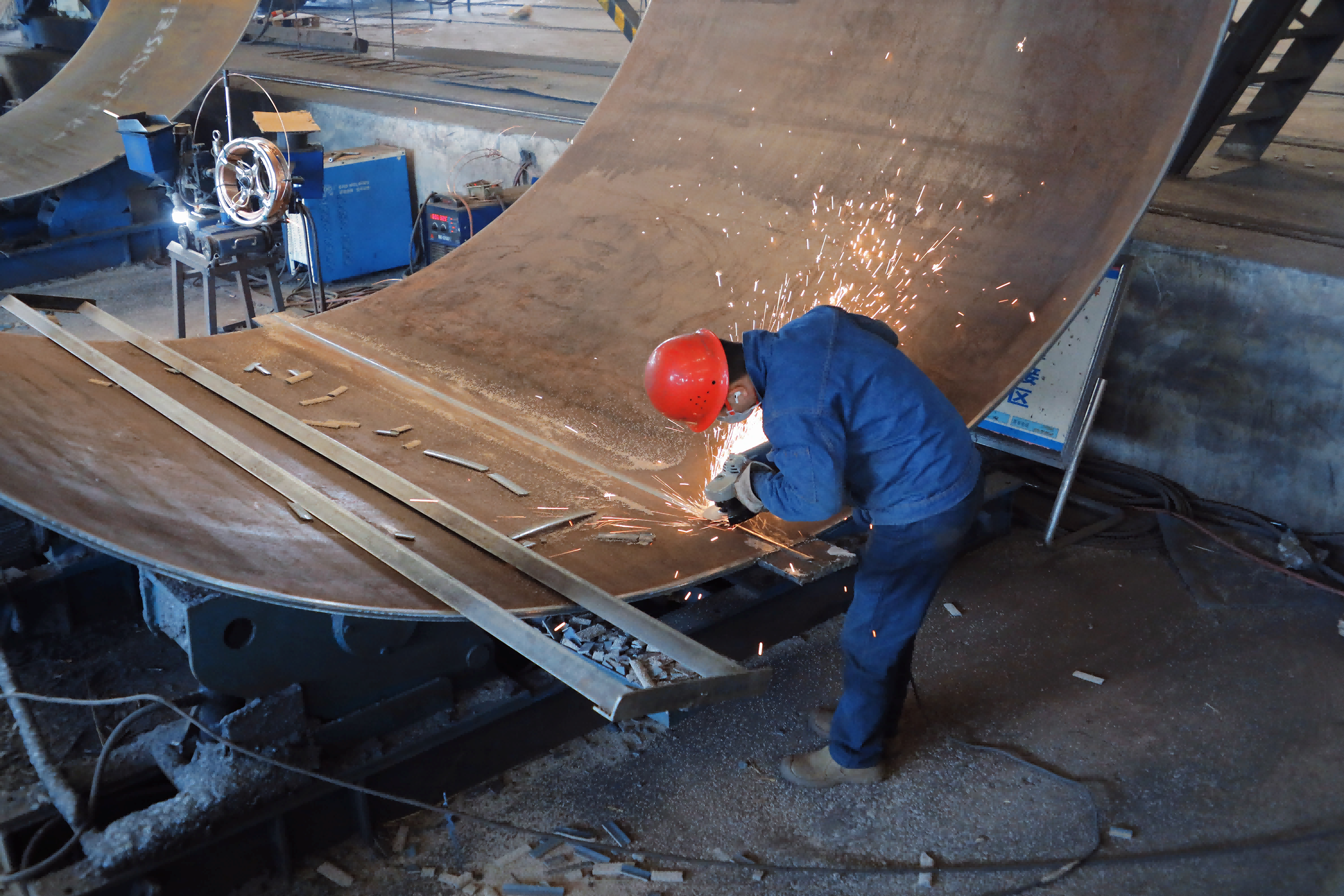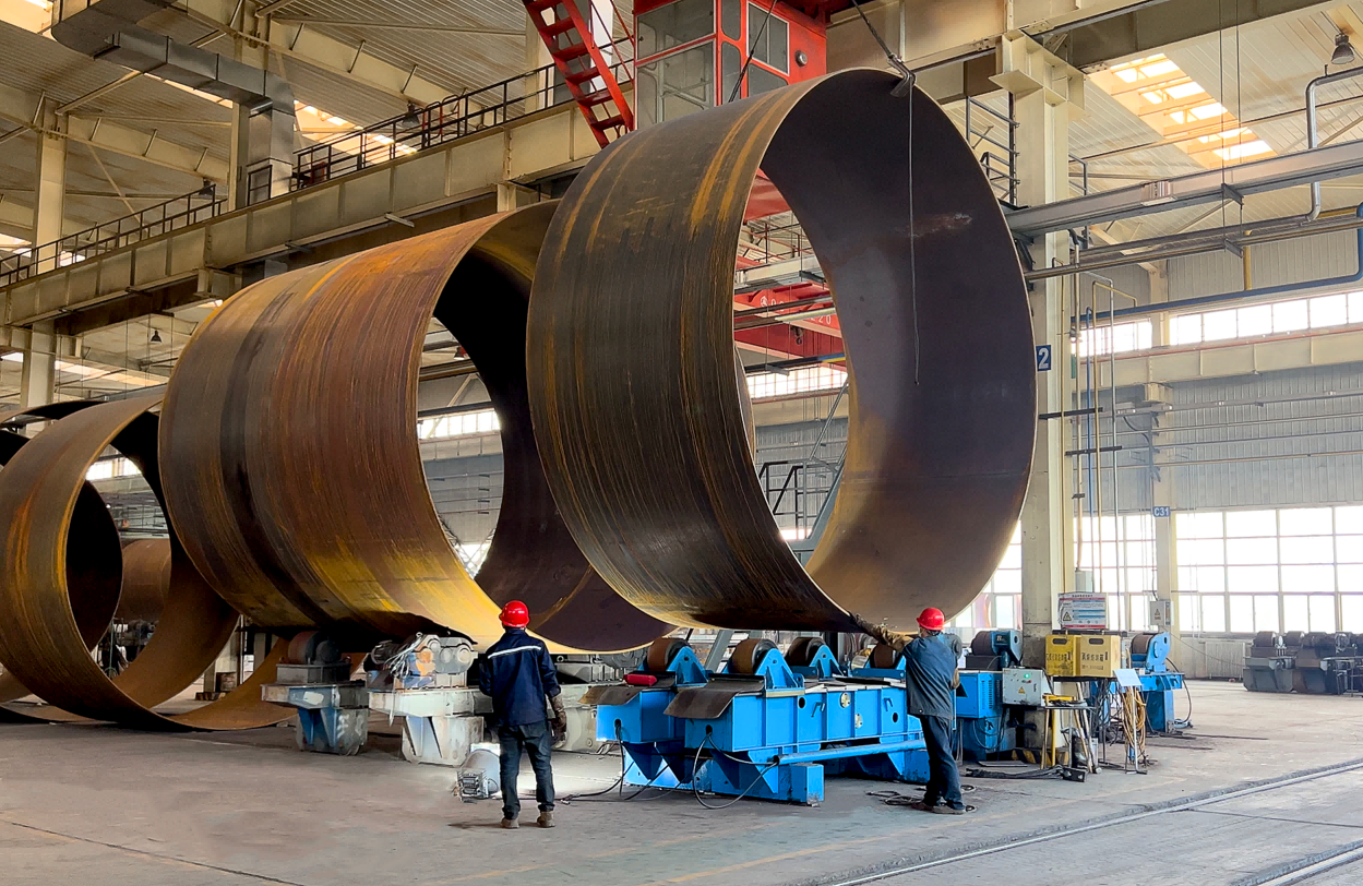 踏入新能源公司本部生產(chǎn)車間,工業(yè)交響曲激昂奏響。切割設備精準運轉,卷板機械有力起伏,焊接火花璀璨綻放,各道工序緊密銜接、井然有序。這里承建的金風科技白銀靖遠山東綠色能源一期風電場項目、上海電建松山灘灘口 200MW風電項目、甘肅定西通渭“十四五”第二批集中式風電項目等多個甘肅省重點風電項目正緊張施工中。生產(chǎn)線上,工人們將一段段筒圈精準組對,隨著機械的運轉,巨大的筒圈被緩緩吊起、對接。直徑達5.3米的巨型塔筒在精密操作下逐步成型。每套由5段組成、每段包含10個單節(jié)的塔筒,需歷經(jīng)下料、卷板、縱縫、回圓、組對、環(huán)焊、內(nèi)件、檢測、防腐等復雜且嚴謹?shù)墓ば?,每一步都凝聚著建設者的匠心與專注。